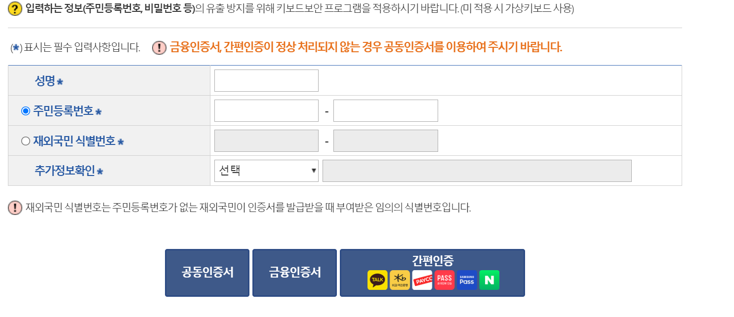 - 본인인증: 필수입력사항을 입력했으면, 공동인증서, 금융인증서, 간편인증 중 하나를 선택하여 본인인증을 완료하면 됩니다.