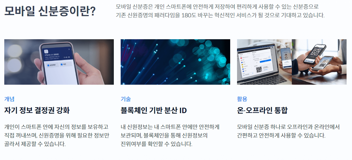 모바일신분증은 전통적인 신분증, 예를 들면 운전 면허증이나 신용카드와 같은 물리적인 신분증을 디지털 형태로 대체하는 기술입니다. 이는 스마트폰 앱을 통해 개인 정보와 신원을 관리하고 제3자와 안전하게 공유할 수 있는 방법을 제공합니다. 이로써, 우리는 더 이상 종이 신분증을 소지해 다니지 않아도 되며, 필요한 경우 언제든지 모바일 기기로 확인할 수 있습니다.