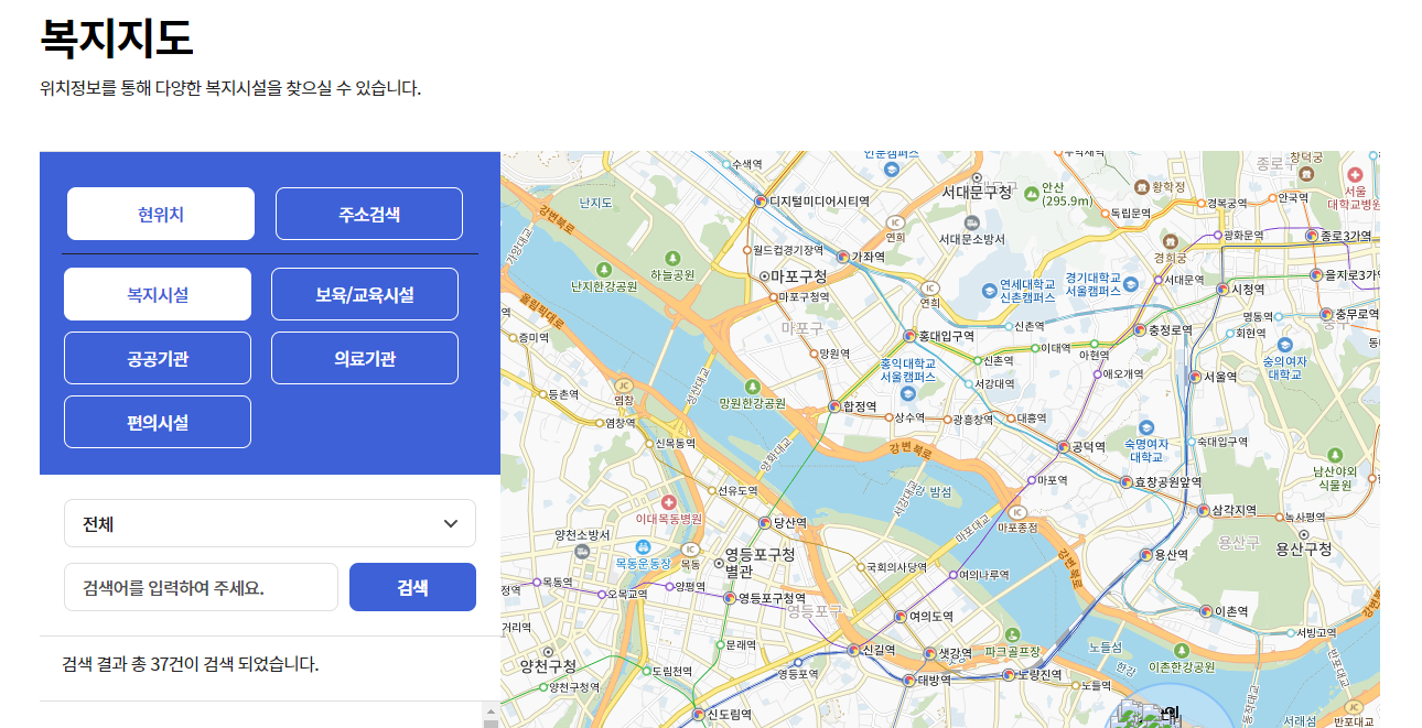 5. 복지지도 (복지 관련 시설 및 기관 정보를 사용자의 위치나 선택한 지역 지도 기반으로 정보 제공)