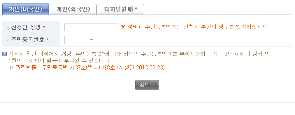 - 신청인의 이름과 주민등록번호를 입력하고 확인을 클릭합니다.
